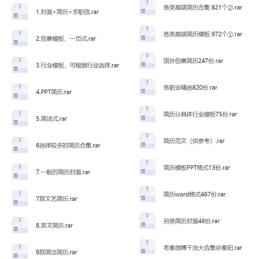 这些简历模版都是我在外面花高价买来的,各种各样的简历模版都有,以下是部分截图(可以全部下载挑选合适的),而且模版的质量非常高,现在就业环境这么差,需要简历去应聘的人太多了,小红书上,也有很多博主在卖这个简历模版,你也可以拿去小红书这些平台去卖,一单卖个9.9、29.9,完全没压力,卖出去就是利润。